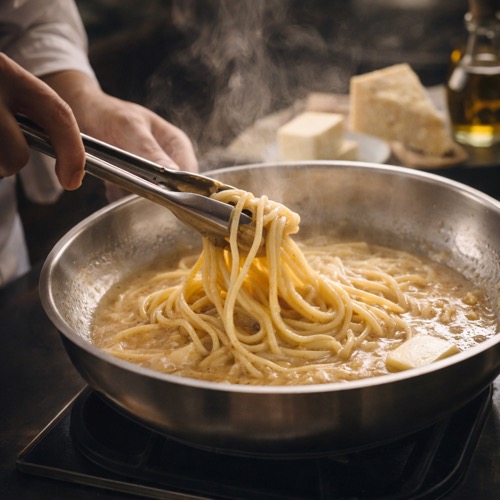 이 과정이 제대로 이루어지면 소스는 분리되지 않고 윤기 있고 부드러운 질감을 갖게 됩니다. 레스토랑 파스타가 특별히 촉촉하고 크리미한 이유가 바로 여기에 있습니다.