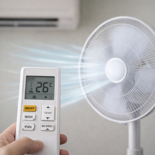 배치 팁: 에어컨을 등지고 선풍기를 머리 위 방향으로 틀어주세요. 차가운 공기는 아래로 내려가는 성질이 있어 실내 전체 공기를 빠르게 순환시켜 줍니다.