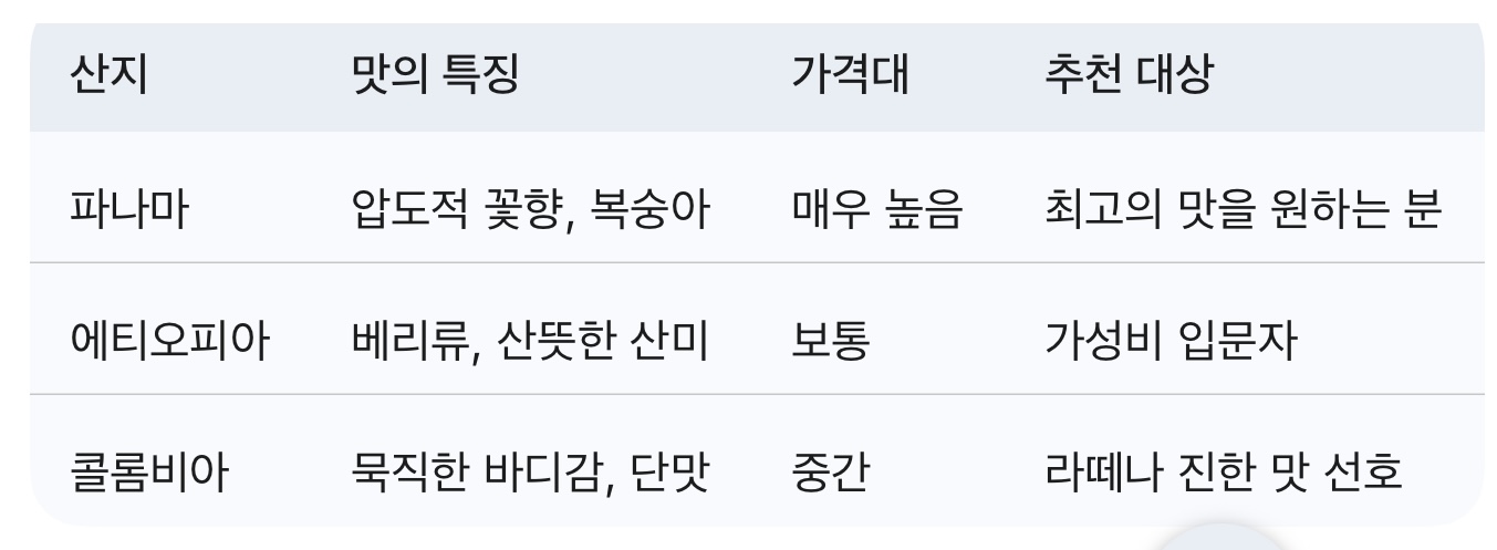 * 콜롬비아/코스타리카: 최근 뛰어난 재배 기술로 합리적인 가격의 고품질 게이샤를 선보이고 있어 입문자들에게 추천합니다.