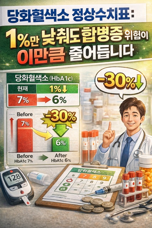 당화혈색소 수치는 하루아침에 바뀌지 않습니다. 하지만 매일의 작은 습관이 쌓여 3개월 뒤 숫자로 증명됩니다. 1%를 낮추는 노력은 여러분의 수명을 10년 이상 연장하는 가장 가치 있는 투자입니다.